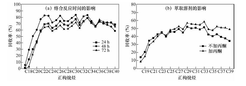 n-alkanes were recovered by hexane in aqueous phase and by a mixture of hexane and acetone in organic phases. The recoveries of middle-and long-chain