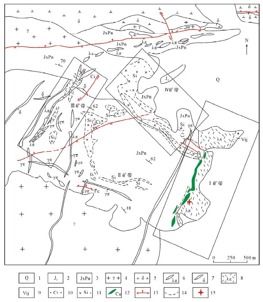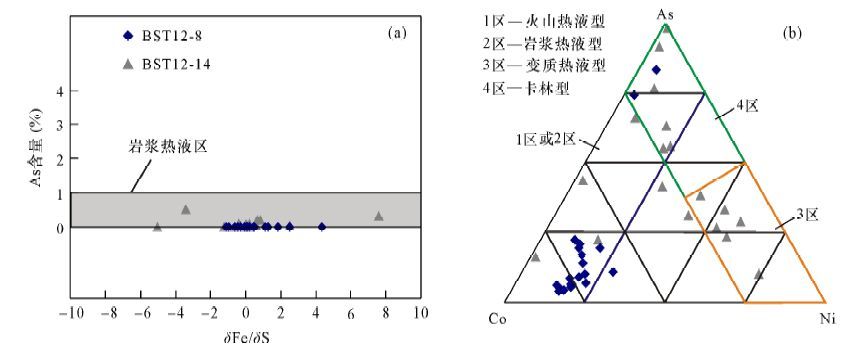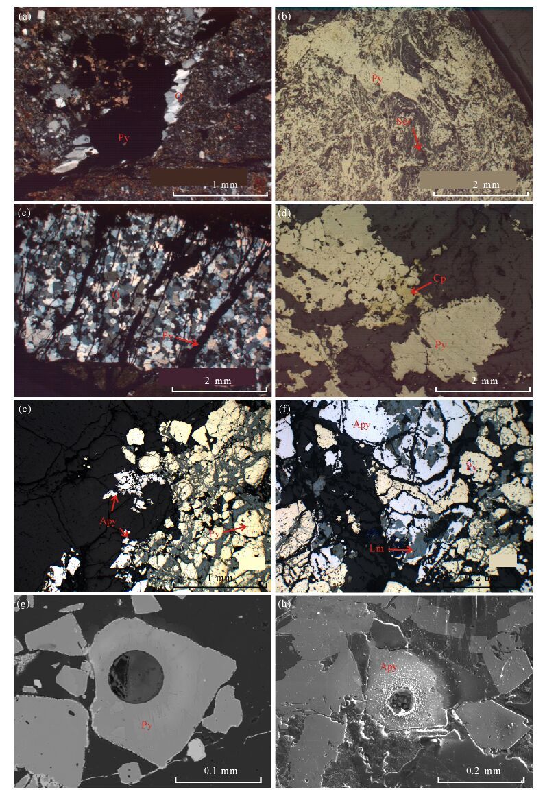 2, and the analysis time of single point is 60 s. Iron was used as an internal standard and MASS-1 was used to calibrate the data. Analysis precision of most elements is better than 10%. For the similar optical properties of pyrite and arsenopyrite, the differences of physical properties can be used to distinguish them. Pyrite in the Baishantang porphyry copper deposit is depleted in sulfur but rich in iron, indicating a hydrothermal origin. The trace element composition of pyrite indicates that pyrite was formed at a medium depth and belongs to the medium-low temperature hydrothermal type related to volcanism. This conclusion has provided important evidence for the ore genesis and the source of ore-forming fluids of the Baishantang porphyry copper deposit, which can also guide the next-step exploration.
