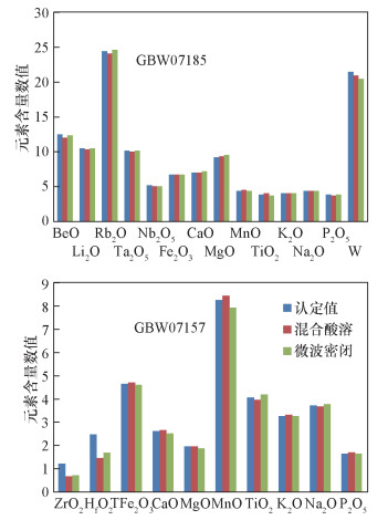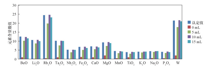 • 摘要: 稀有多金属矿各类选矿样品中同一元素的含量相差较大,且同一样品中各元素的含量也有较大差异,如铌钽锂铍在尾矿和原矿中的含量只有几十至几百μg/g,而在精矿中的含量达到百分之几至百分之几十,伴生元素如钾、钠在不同样品中也有较大差异。应用敞口酸熔-电感耦合等离子体发射光谱法(ICP-OES)测定铌钽锂铍等元素通常采用三酸或四酸分解样品,多是测定尾矿、原矿及部分中矿样品中较低含量的铌钽锂铍,且同一测定体系中只测定了一种或两种元素。本文采用氢氟酸-硝酸-盐酸-高氯酸-硫酸分解样品,以3~4滴氢氟酸+5%硫酸+5%过氧化氢提取体系替代常规的有机酸(酒石酸等)提取体系,实现了应用ICP-OES同时测定稀有金属矿选矿试验各阶段产品中不同含量的铌钽锂铍钾钠铷铁钛等元素。各元素的谱线强度在0~500 μg/mL浓度范围内呈良好的线性关系,相对标准偏差为0.37%~4.77%(n=6)。该方法提高了选矿全流程样品中各类元素的分析效率,已在选冶试验流程样品分析中得到了应用。