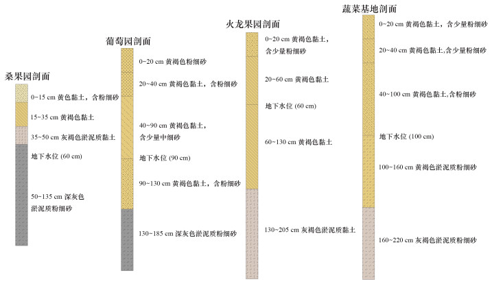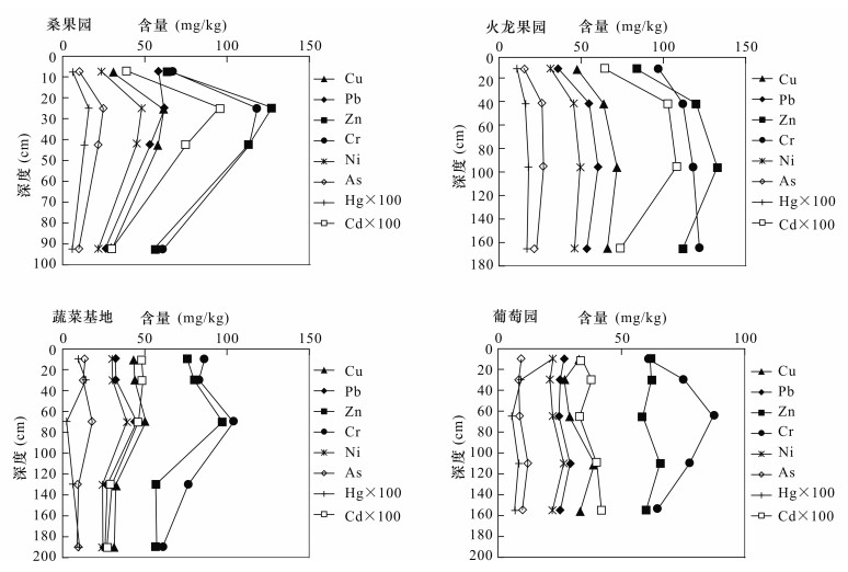 RESULTSIt was revealed that the content of Cd in surface soil was relatively high, with the average value 3.7 times higher than the background value in the Pearl River Delta (0.11 mg/kg), classified as moderate pollution scale and serious potential ecological risk. The Cd pollution was related to the long-term cadmium phosphate fertilizer overuse having a mean cadmium phosphate fertilizer content of 20.5 mg/kg. The average contents of Cu, Pb, Zn, Cr, Ni, As, and Hg in surface soil were lower than the soil environmental standard Ⅰ and was classified as low potential ecological risk. The vertical distribution of 8 heavy metals in four soil profiles presented different characteristics, which was influenced by the heterogeneity and discontinuity of the soil. The concentrations of heavy metals in the irrigation water and edible parts of five agricultural products were in compliance with standards. Bok choy and ficus carica had higher potential in enriching heavy metals, while aspartame, jujube and dragon fruit had lower enrichment potential.