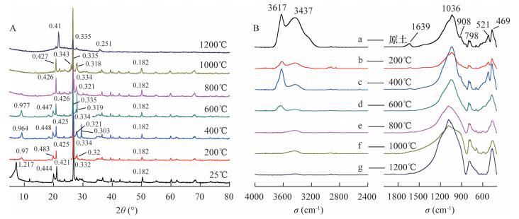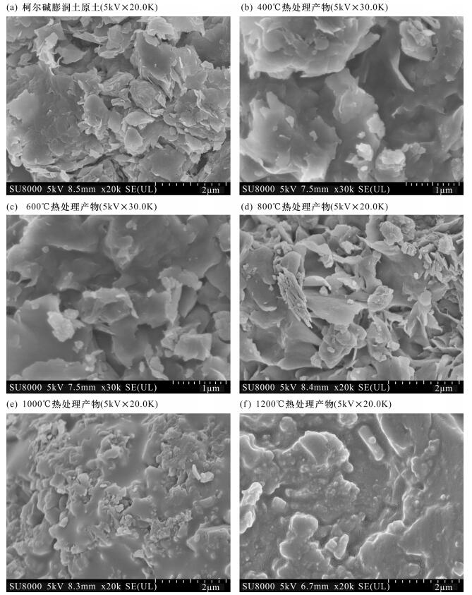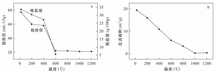 RESULTSWith the increase of heat treatment temperature, the specific surface area of Kerjian bentonite decreased gradually, and the phase composition and structure changed greatly. When heated to 600℃, the blue absorption and colloid value of bentonite decreased sharply, and the hydroxyl groups in the main component montmorillonite octahedron sheet began to break out, while the layered structure was damaged. The montmorillonite phase disappeared above 800℃. A new mineral phase cordierite was produced at 1000℃. Above 1200℃, the mineral was transformed into quartzite phase, the particles were completely melted, and the recrystallization was obvious.
