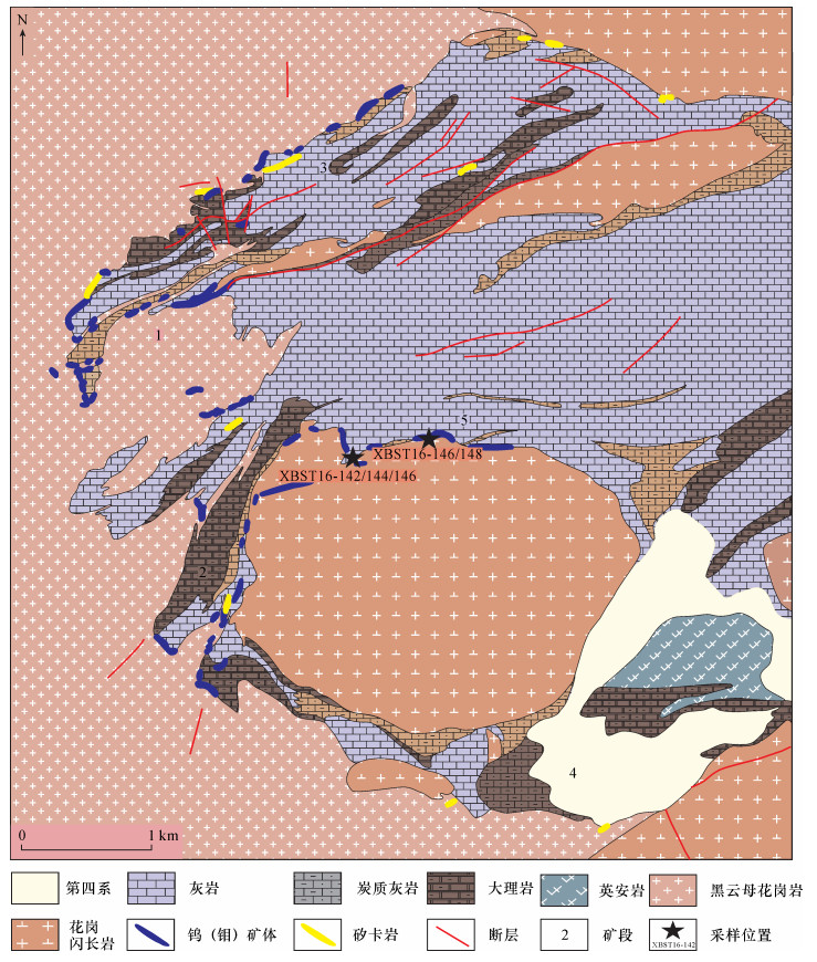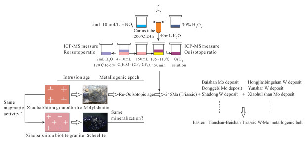 BACKGROUNDThe Xiaobaishitou W-(Mo) deposit is located in the Central Tianshan Massif of the Eastern Tianshan, Northwestern China. The deposit is a skarn-type tungsten-molybdenum deposit formed by biotite granite and granodiorite intruding into the Mesoproterozoic Kawabulag Group. As one of the most important ore minerals, molybdenite is distributed in granodiorite, biotite granite, skarn and quartz veins.