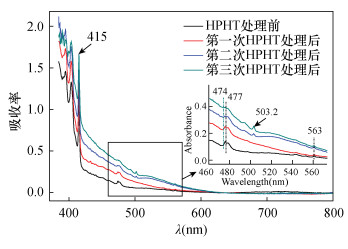 RESULTSThe color of the diamonds changed from grayish brown to brownish yellow after the HPHT process. Meanwhile, the FTIR/UV-Vis absorption, as well as the photoluminescence was also greatly changed. Besides the 415nm and the 477nm absorption peaks, the treated diamonds also display H3 defect (503.2nm) and the gradually increasing absorption from 550nm to shortwave, resulted in the color changing from grayish brown to brownish yellow. In the mid-infrared region, the three peaks of 1498, 1520 and 1547cm-1 become a broad band centered at 1498cm-1 after treatment, and the photoluminescence spectrum displayed two distinct defects-H3 (503.2nm) and H2 (986.2nm).