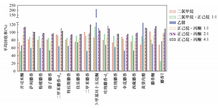 RESULTSThe linear range of this method for fourteen target compounds ranged from 5ng/mL to 200ng/mL. The average spike-added recoveries ranged from 70.6% to 121.5%, the relative standard deviations (RSD, n=7) were 0.97%-19.5%. The recoveries of surrogates were 72.2%-116.8%. The detection limits of the method were 0.10-0.19ng/g for nitro musk, 0.09-0.14ng/g for polycyclic musk, and 0.11-1.93ng/g for macrocyclic musk.