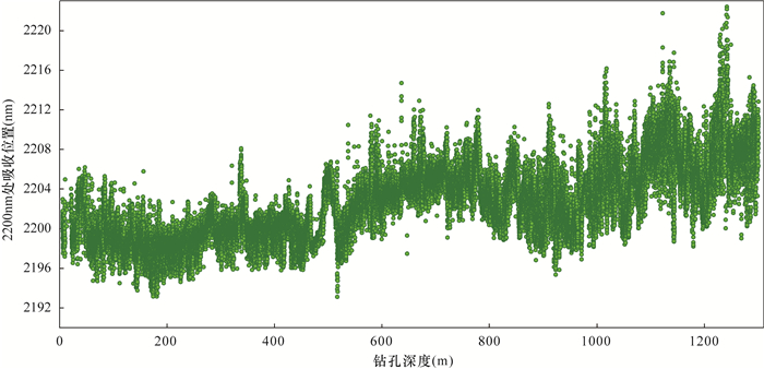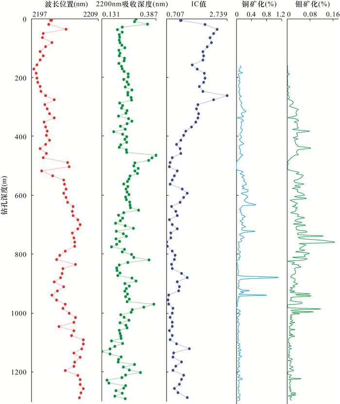 RESULTSThe alteration minerals of the Wunugetushan porphyry copper molybdenum deposit mainly included quartz, potassium feldspar, sericite, illite, kaolinite and montmorillonite. The alteration mineral assemblage showed obvious zonation in space. Quartz+illite+sericite+potassium feldspar had the closest relationship with mineralization and can be used as the standard mineral assemblage for ore prospecting. By comparing with the spatial distribution of Cu and Mo mineralization, the wavelength shift of the absorption peak at 2200nm to shorter wavelengths was closely related to the mineralization center, and the IC value of illite reflects the degree of crystallization and mineralization.