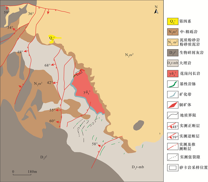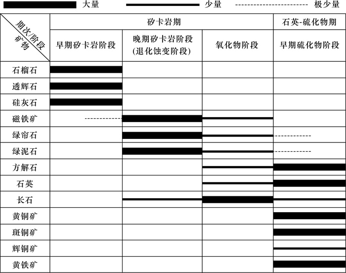 CONCLUSIONS The skarn of the Ahetala copper deposit is a typical calcium skarn of metasomatic skarn. According to the mineral paragenetic association and metasomatism, the mineralization stages of the deposit can be divided into early skarn stage, late skarn stage (retrograde alteration), oxide stage and early sulfide stage. From the skarn period to the quartz-sulfide period, the metallogenic environment generally underwent changes from the high temperature, high oxygen fugacity, intermediate-acidic, weak oxidizing-weak reducing environment, to the low temperature, high sulfur fugacity, alkaline reducing environment.