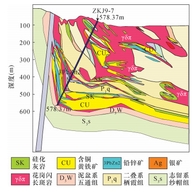 • 摘要: 铜矿床蚀变围岩与伴生矿体有着密切的成因与空间关系,通过分析铜矿床蚀变特征,可获得成矿时物理化学条件,热液中成矿元素的迁移、富集以及演化规律,最终指示铜矿床矿化富集程度以及矿体赋存位置。本文通过对城门山铜矿床外围铁路坎矿区的代表性岩心进行高光谱岩心扫描系统快速分析,结果显示在ZKJ9-7典型钻孔中,0~350m处以蒙脱石和碳酸盐典型光谱曲线为主;350~578m处以高岭土和白云母典型光谱曲线为主。通过矿物解译,自地表向下,城门山铁路坎矿区的矿物变化规律为:蒙脱石+高岭石→碳酸盐+蒙脱石→碳酸盐→白云母+高岭石+蒙脱石→白云母+高岭石+绿泥石。矿区浅部区域主要受花岗闪长斑岩体与碳酸盐类围岩之间的接触带构造控制;深部区域主要经历矽卡岩化和硅化,部分有绿泥石化,这些蚀变过程有利于铜矿的形成与富集。钻孔深部接触带两侧的岩石发生成分置换而形成矽卡岩,上升溶液沿着碳酸盐类接触面流动时,碳酸盐中的CaO通过粒间溶液,以上升溶液为媒介向硅铁质岩和硅铝质岩石方向扩散。相反,硅铁质岩和硅铝质岩中的FeO、Al2O3和SiO2以同样的方式向灰岩方向扩散,从而接触带两侧的岩石发生成分置换而形成矽卡岩。富铜矽卡岩型矿床的形成与溶液和岩石间的组分交换密切相关,组分的浓度差所引起的扩散作用在其中发挥了重要作用。