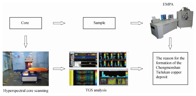 BACKGROUNDThe altered wall rocks of copper deposits and associated ore bodies have a close genetic and spatial relationship. By analyzing the alteration characteristics of copper deposits, the physical and chemical conditions of the mineralization, the migration, enrichment and evolution of ore-forming elements in the hydrothermal fluid can be obtained. The alteration features ultimately indicate the mineralization degree of the copper deposit and the location of the ore body. The hyperspectral core scanning system is a new type of technical testing method, developed in recent years. This article documents the first time of studying the representative cores from the Chengmenshan Tielukan copper deposit by the hyperspectral core scanning system. At the same time, altered minerals were analyzed by electron probe microanalysis (EMPA). Thus, further revealing the metallogenic mechanism of the Chengmenshan copper deposit.
